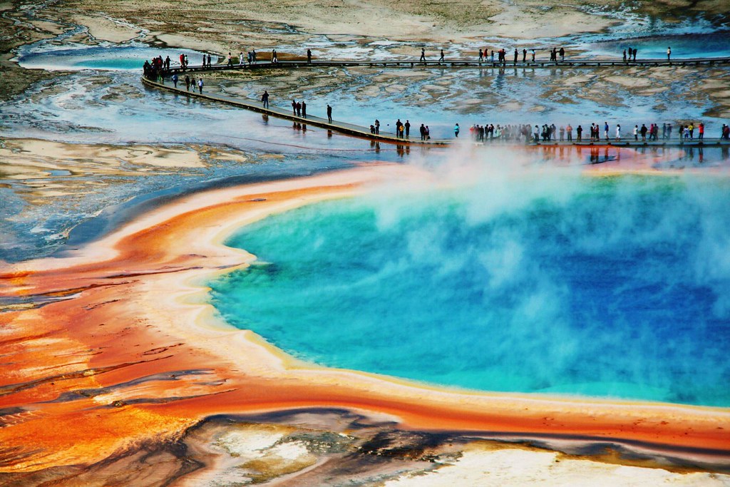 大棱镜温泉-美国 大棱镜温泉(The Grand Prismatic Spring),又称大虹彩温泉,位于美国黄石国家公园经纬坐标44.524569, -110.837975处,直径约100米,是美国最大,世界第三大的温泉。它宽约75至91米,49米深,水温高达85℃,每分钟约会涌出2000升泉水。最早于1839年为探险家所发现。 大棱镜温泉也是黄石公园里最有名的温泉之一。大棱镜温泉的美在于湖面的颜色随季节而改变,春季,湖面从绿色变为灿烂的橙红色,这是由于富含矿物质的水体中生活着的藻类和含色素的细菌等微生物,它们体内的叶绿素和类胡萝卜素的比例会随季节变换而改变,于是水体也就呈现出不同的色彩。在夏季,叶绿素含量相对较低,显现橙色、红色,或黄色。但到了冬季,由于缺乏光照,这些微生物就会产生更多的叶绿素来抑制类胡萝卜素的颜色,于是就看到水体呈现深绿色。 |