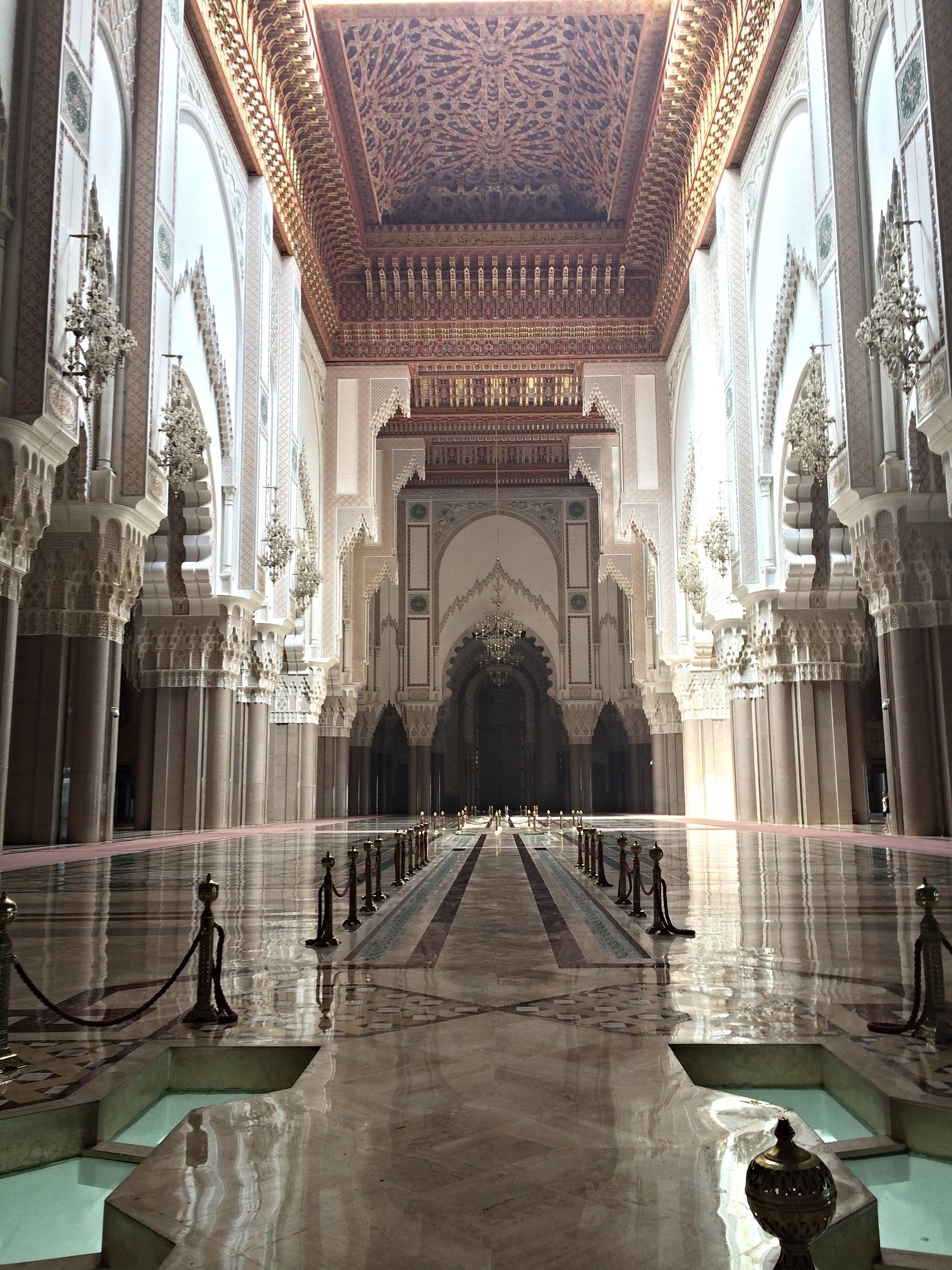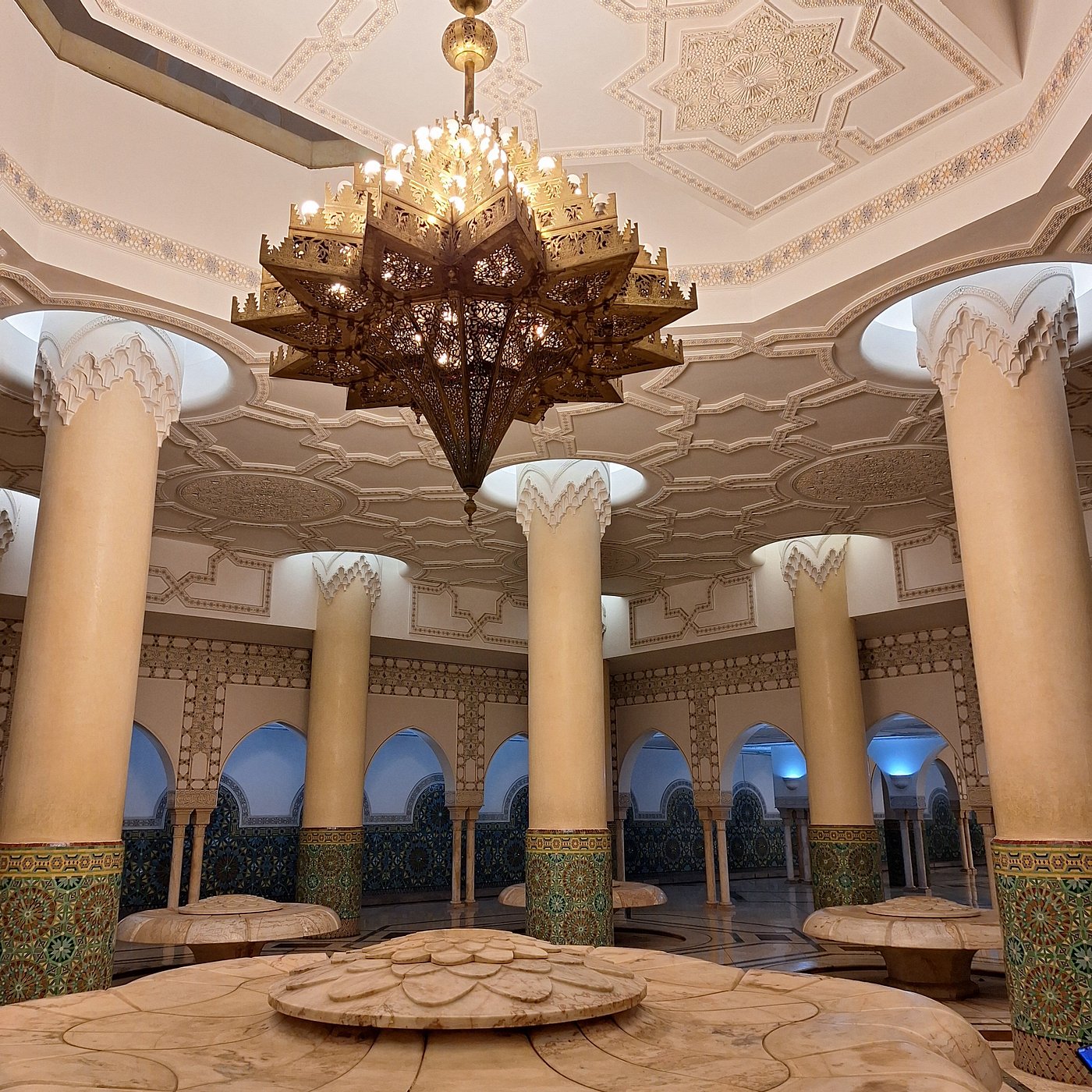 建筑细节 选址在卡萨布兰卡海岸边,部分建筑架设在大西洋之上,象征着“神的宝座”漂浮在海面。210米高,是全球最高的清真寺宣礼塔,塔顶装有激光灯,夜晚可照射至穆斯林圣城麦加的方向。室内礼拜大厅可容纳约25,000人。室外广场可同时容纳80,000名信徒。大量使用本地大理石、花岗岩、木材和马赛克,体现摩洛哥传统工艺。大量手工雕刻的木质天花板和门窗。精美的阿拉伯式几何图案和花卉纹饰。马赛克拼花覆盖墙面和地板,色彩丰富。