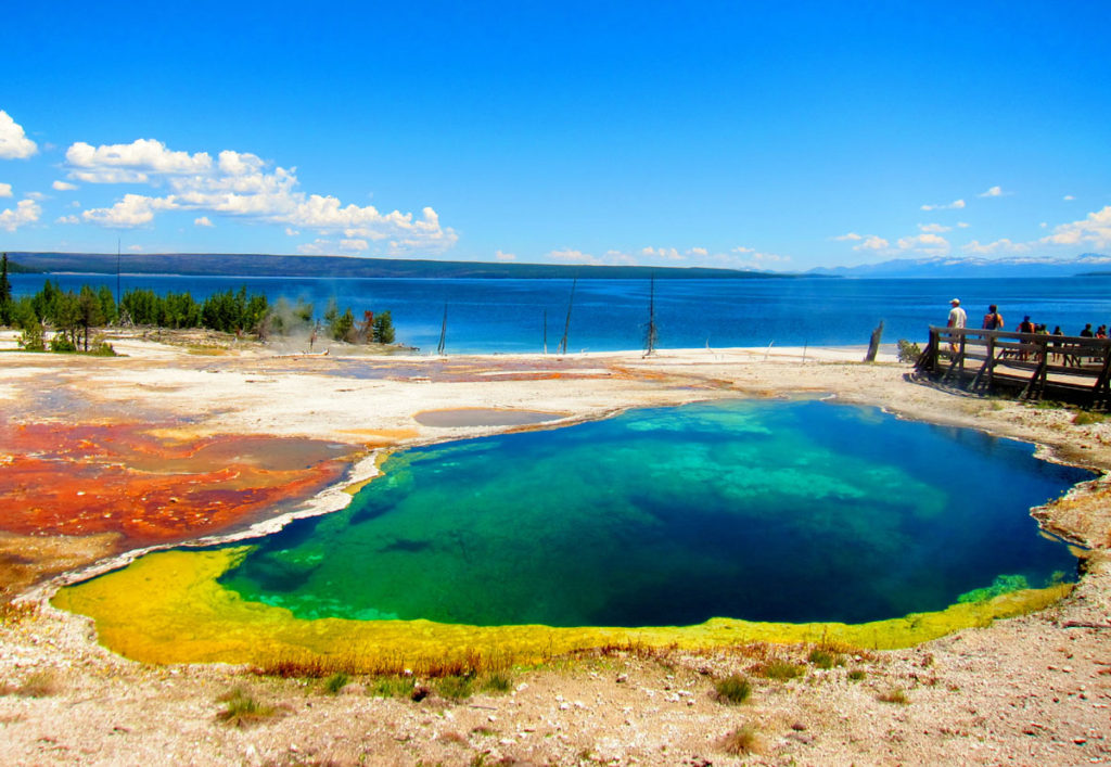 大棱镜温泉-美国 大棱镜温泉(The Grand Prismatic Spring),又称大虹彩温泉,位于美国黄石国家公园经纬坐标44.524569, -110.837975处,直径约100米,是美国最大,世界第三大的温泉。它宽约75至91米,49米深,水温高达85℃,每分钟约会涌出2000升泉水。最早于1839年为探险家所发现。 大棱镜温泉也是黄石公园里最有名的温泉之一。大棱镜温泉的美在于湖面的颜色随季节而改变,春季,湖面从绿色变为灿烂的橙红色,这是由于富含矿物质的水体中生活着的藻类和含色素的细菌等微生物,它们体内的叶绿素和类胡萝卜素的比例会随季节变换而改变,于是水体也就呈现出不同的色彩。在夏季,叶绿素含量相对较低,显现橙色、红色,或黄色。但到了冬季,由于缺乏光照,这些微生物就会产生更多的叶绿素来抑制类胡萝卜素的颜色,于是就看到水体呈现深绿色。 |
