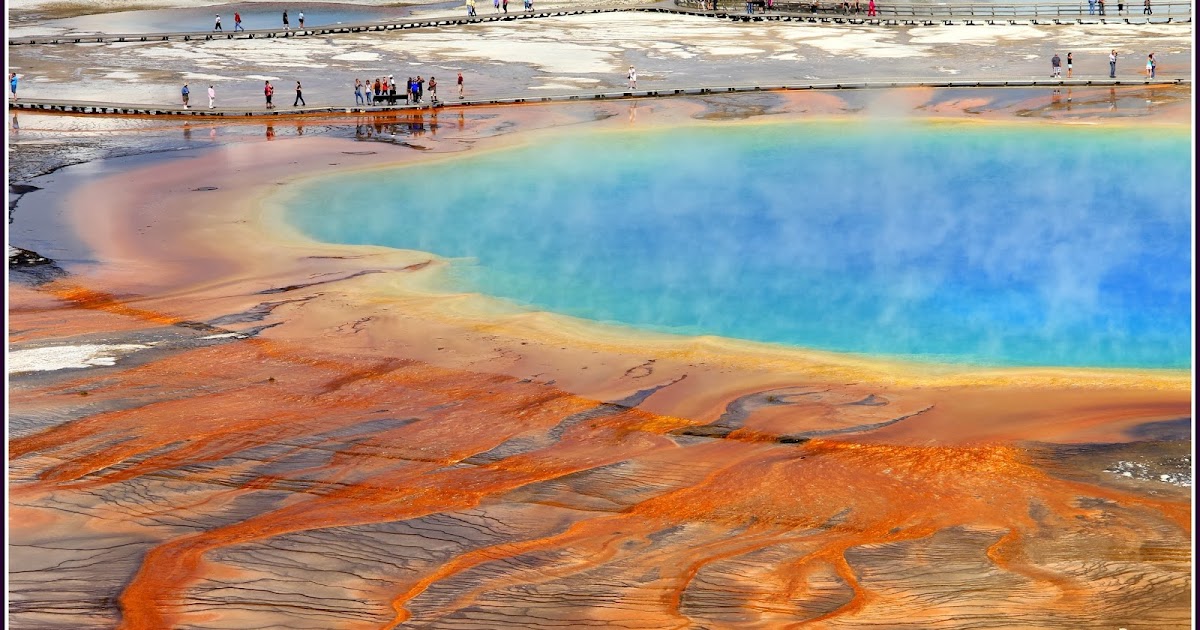 大棱镜温泉也是黄石公园里最有名的温泉之一。大棱镜温泉的美在于湖面的颜色随季节而改变,春季,湖面从绿色变为灿烂的橙红色,这是由于富含矿物质的水体中生活着的藻类和含色素的细菌等微生物,它们体内的叶绿素和类胡萝卜素的比例会随季节变换而改变,于是水体也就呈现出不同的色彩。在夏季,叶绿素含量相对较低,显现橙色、红色,或黄色。但到了冬季,由于缺乏光照,这些微生物就会产生更多的叶绿素来抑制类胡萝卜素的颜色,于是就看到水体呈现深绿色。