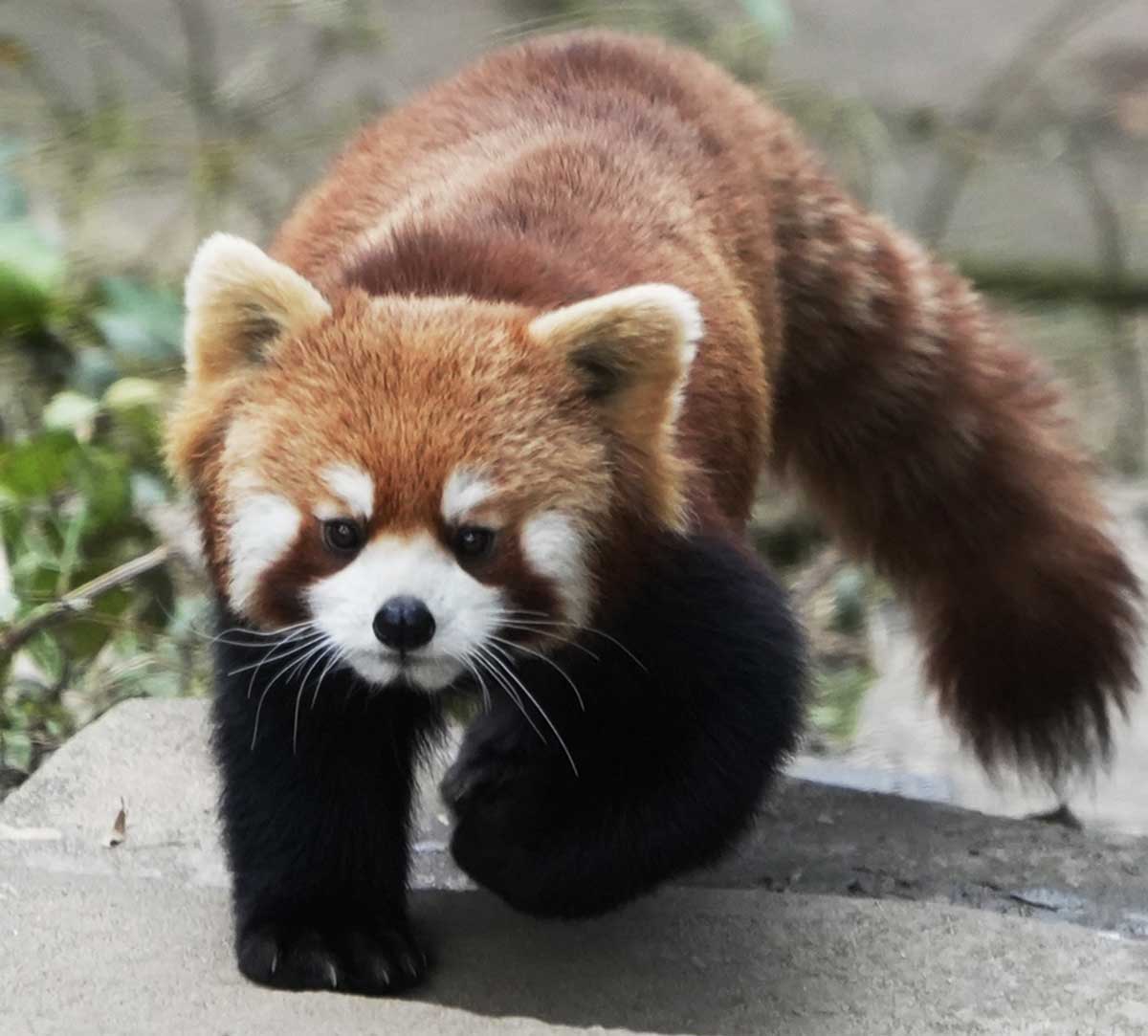 小熊猫有着红褐色的皮毛和长而蓬松的尾巴,且由于前肢较短,所以步态摇摆蹒跚。小熊猫体型比家猫略大,躯干更长且体重较重。它是一种树栖运动动物,主要以竹笋为主食,但也会杂食禽蛋、鸟类、昆虫和小型哺乳动物。在野外自然条件下它是一种独居动物,黄昏到黎明是其主要活动期,而白天大部分时间处于静栖状态。