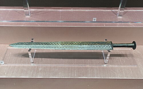 中国最早期的剑是用玉或石制造的,青铜剑出现于商代,商代也开始有制剑的史料记载。西周时期中原地区以车战为主,剑在当时是作为弓矢、长兵器之后的近战短兵器,处于辅助的地位。在吴、越等地区则不同,水网纵横,多山林,近身战使用短兵器的机会较多,是以将剑作为主要武器,春秋时期的名剑也因此大多出于这些地区,例如越王勾践剑。战国时期车战衰落,步战兴起,青铜剑成为步兵的标准装备之一。随着剑在战争中的地位上升,剑的长度也逐步加长,从春秋到战国早期的约50公分到秦始皇时期的80至90公分。东周时期盛行佩剑之风,剑身上的装饰也日益华美。菱形暗格纹剑•春秋晚期