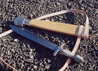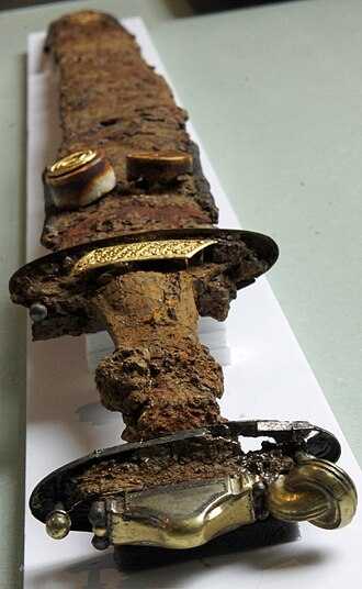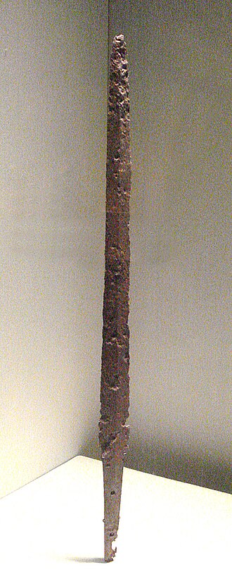 Spatha: 一种直长剑,长度在 0.5 至 1 米(20 至 40 英寸)之间,剑柄长度在 18 至 20 厘米(7 至 8 英寸)之间