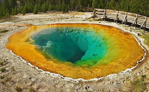 大棱镜温泉也是黄石公园里最有名的温泉之一。大棱镜温泉的美在于湖面的颜色随季节而改变,春季,湖面从绿色变为灿烂的橙红色,这是由于富含矿物质的水体中生活着的藻类和含色素的细菌等微生物,它们体内的叶绿素和类胡萝卜素的比例会随季节变换而改变,于是水体也就呈现出不同的色彩。在夏季,叶绿素含量相对较低,显现橙色、红色,或黄色。但到了冬季,由于缺乏光照,这些微生物就会产生更多的叶绿素来抑制类胡萝卜素的颜色,于是就看到水体呈现深绿色。 |