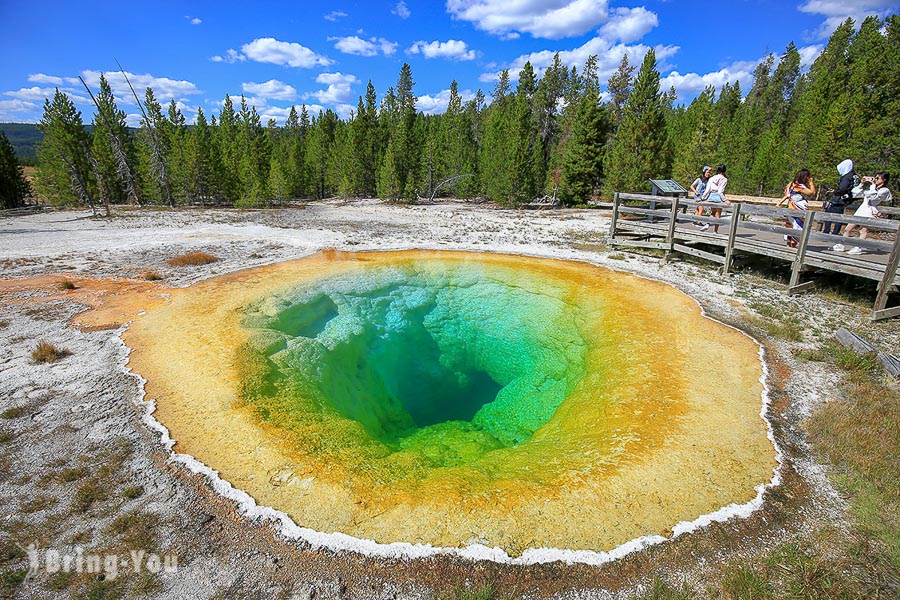 大棱镜温泉也是黄石公园里最有名的温泉之一。大棱镜温泉的美在于湖面的颜色随季节而改变,春季,湖面从绿色变为灿烂的橙红色,这是由于富含矿物质的水体中生活着的藻类和含色素的细菌等微生物,它们体内的叶绿素和类胡萝卜素的比例会随季节变换而改变,于是水体也就呈现出不同的色彩。在夏季,叶绿素含量相对较低,显现橙色、红色,或黄色。但到了冬季,由于缺乏光照,这些微生物就会产生更多的叶绿素来抑制类胡萝卜素的颜色,于是就看到水体呈现深绿色。
