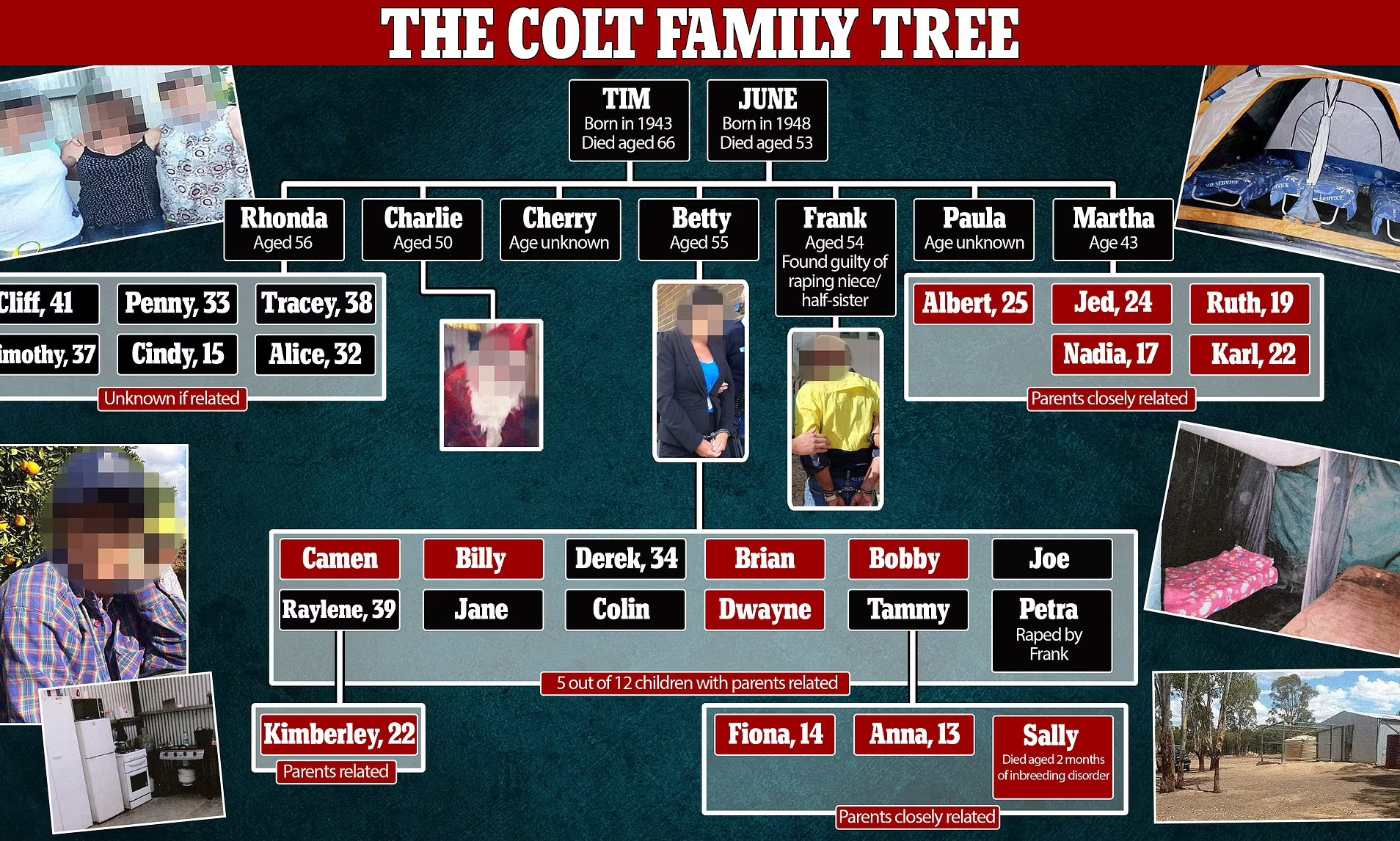 周围的警察赶忙拉开了娜迪亚,可她还表现出几分不解来。“我只是在和你打招呼而已啊”,娜迪亚这样说道。现场的警察和老师又疑惑又气愤,到底是一个怎么样的家庭才会这样教孩子啊??!!警察决定马上找到娜迪亚的家人并逮捕他们。于是娜迪亚被带到了警局进行DNA比对,结果很快就出来了,可结果却惊呆了警察们......娜迪亚竟然也是柯尔特家族的一员!!??警察们赶忙询问娜迪亚关于她家族的事,而从娜迪亚的口中,警察很快知道了柯尔特家族的大概构成。柯尔特家族一共有四代人,38名家庭成员。最早的一代则是娜迪亚的祖父蒂姆和祖母琼......