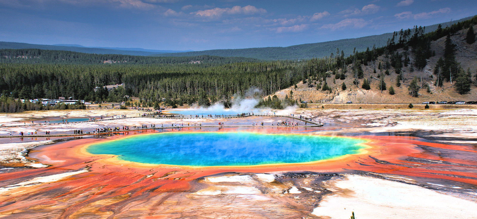 大棱镜温泉也是黄石公园里最有名的温泉之一。大棱镜温泉的美在于湖面的颜色随季节而改变,春季,湖面从绿色变为灿烂的橙红色,这是由于富含矿物质的水体中生活着的藻类和含色素的细菌等微生物,它们体内的叶绿素和类胡萝卜素的比例会随季节变换而改变,于是水体也就呈现出不同的色彩。在夏季,叶绿素含量相对较低,显现橙色、红色,或黄色。但到了冬季,由于缺乏光照,这些微生物就会产生更多的叶绿素来抑制类胡萝卜素的颜色,于是就看到水体呈现深绿色。