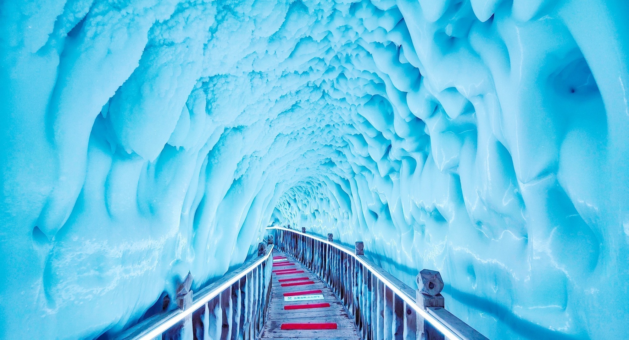 走进冰洞,仿佛瞬间穿越到了一个冰雪王国。洞顶和洞壁上挂满了形态各异的冰柱、冰笋、冰瀑,在灯光的映衬下,折射出五彩斑斓的光芒,如梦如幻。这里的冰晶结构奇特,有的似莲花绽放,有的如玉树琼枝,千姿百态,栩栩如生。