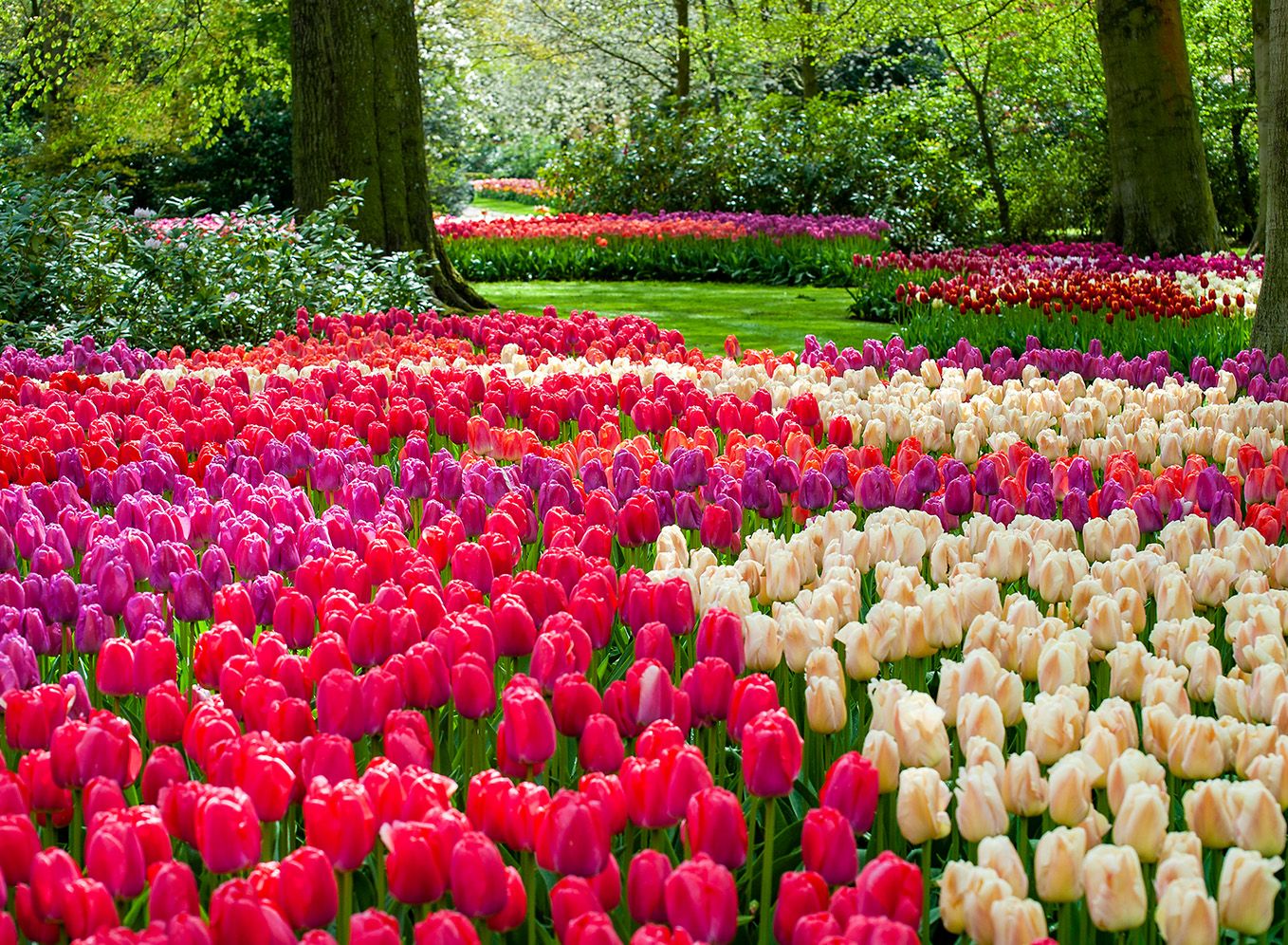 库肯霍夫公园-荷兰 库肯霍夫(Keukenhof,发音为/ˈkøːkənˌhɔf/,在荷兰文中意为Kitchen garden,厨房花园,因15世纪时园内主要种植贵族厨房所需的草药和蔬菜而得名),又称欧洲花园(Garden of Europe),位于阿姆斯特丹近郊盛产球根花田的小镇利瑟(Liess),是每年花卉游行的必经之路,占地33公顷,是世界上最大的花园。根据库肯霍夫公园的官方网站,大约7,000,000株花球茎被种植于该公园内。该公园对面就是库肯霍夫城堡。 库肯霍夫公园每年3月下旬至5月上旬对外开放。 |