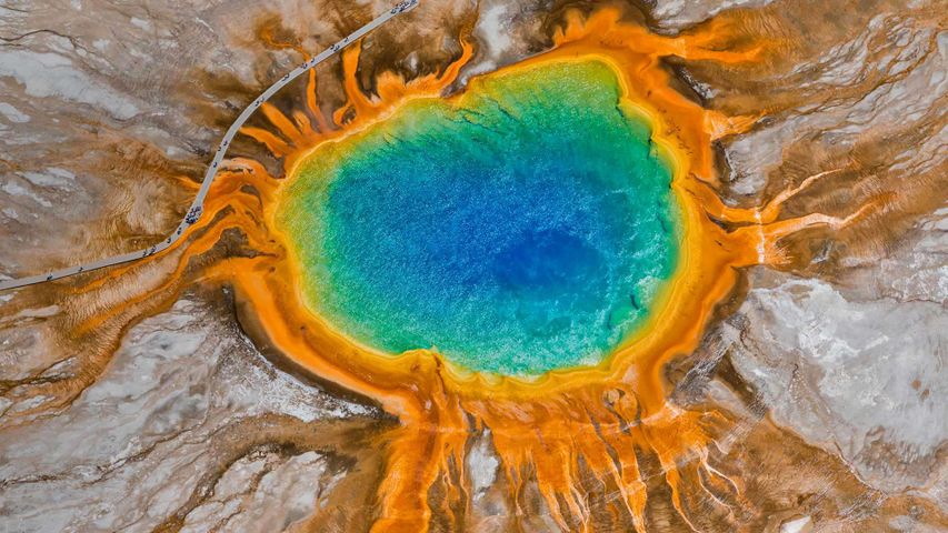 大棱镜温泉-美国 大棱镜温泉(The Grand Prismatic Spring),又称大虹彩温泉,位于美国黄石国家公园经纬坐标44.524569, -110.837975处,直径约100米,是美国最大,世界第三大的温泉。它宽约75至91米,49米深,水温高达85℃,每分钟约会涌出2000升泉水。最早于1839年为探险家所发现。 大棱镜温泉也是黄石公园里最有名的温泉之一。大棱镜温泉的美在于湖面的颜色随季节而改变,春季,湖面从绿色变为灿烂的橙红色,这是由于富含矿物质的水体中生活着的藻类和含色素的细菌等微生物,它们体内的叶绿素和类胡萝卜素的比例会随季节变换而改变,于是水体也就呈现出不同的色彩。在夏季,叶绿素含量相对较低,显现橙色、红色,或黄色。但到了冬季,由于缺乏光照,这些微生物就会产生更多的叶绿素来抑制类胡萝卜素的颜色,于是就看到水体呈现深绿色。 |