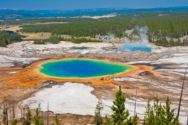 | 大棱镜温泉-美国 大棱镜温泉(The Grand Prismatic Spring),又称大虹彩温泉,位于美国黄石国家公园经纬坐标44.524569, -110.837975处,直径约100米,是美国最大,世界第三大的温泉。它宽约75至91米,49米深,水温高达85℃,每分钟约会涌出2000升泉水。最早于1839年为探险家所发现。大棱镜温泉也是黄石公园里最有名的温泉之一。大棱镜温泉的美在于湖面的颜色随季节而改变,春季,湖面从绿色变为灿烂的橙红色,这是由于富含矿物质的水体中生活着的藻类和含色素的细菌等微生物,它们体内的叶绿素和类胡萝卜素的比例会随季节变换而改变,于是水体也就呈现出不同的色彩。在夏季,叶绿素含量相对较低,显现橙色、红色,或黄色。但到了冬季,由于缺乏光照,这些微生物就会产生更多的叶绿素来抑制类胡萝卜素的颜色,于是就看到水体呈现深绿色。 |