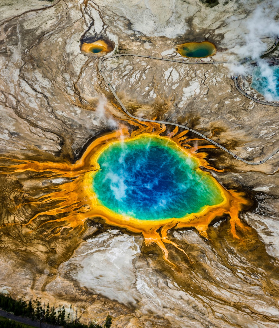 大棱镜温泉-美国 大棱镜温泉(The Grand Prismatic Spring),又称大虹彩温泉,位于美国黄石国家公园经纬坐标44.524569, -110.837975处,直径约100米,是美国最大,世界第三大的温泉。它宽约75至91米,49米深,水温高达85℃,每分钟约会涌出2000升泉水。最早于1839年为探险家所发现。 大棱镜温泉也是黄石公园里最有名的温泉之一。大棱镜温泉的美在于湖面的颜色随季节而改变,春季,湖面从绿色变为灿烂的橙红色,这是由于富含矿物质的水体中生活着的藻类和含色素的细菌等微生物,它们体内的叶绿素和类胡萝卜素的比例会随季节变换而改变,于是水体也就呈现出不同的色彩。在夏季,叶绿素含量相对较低,显现橙色、红色,或黄色。但到了冬季,由于缺乏光照,这些微生物就会产生更多的叶绿素来抑制类胡萝卜素的颜色,于是就看到水体呈现深绿色。 |